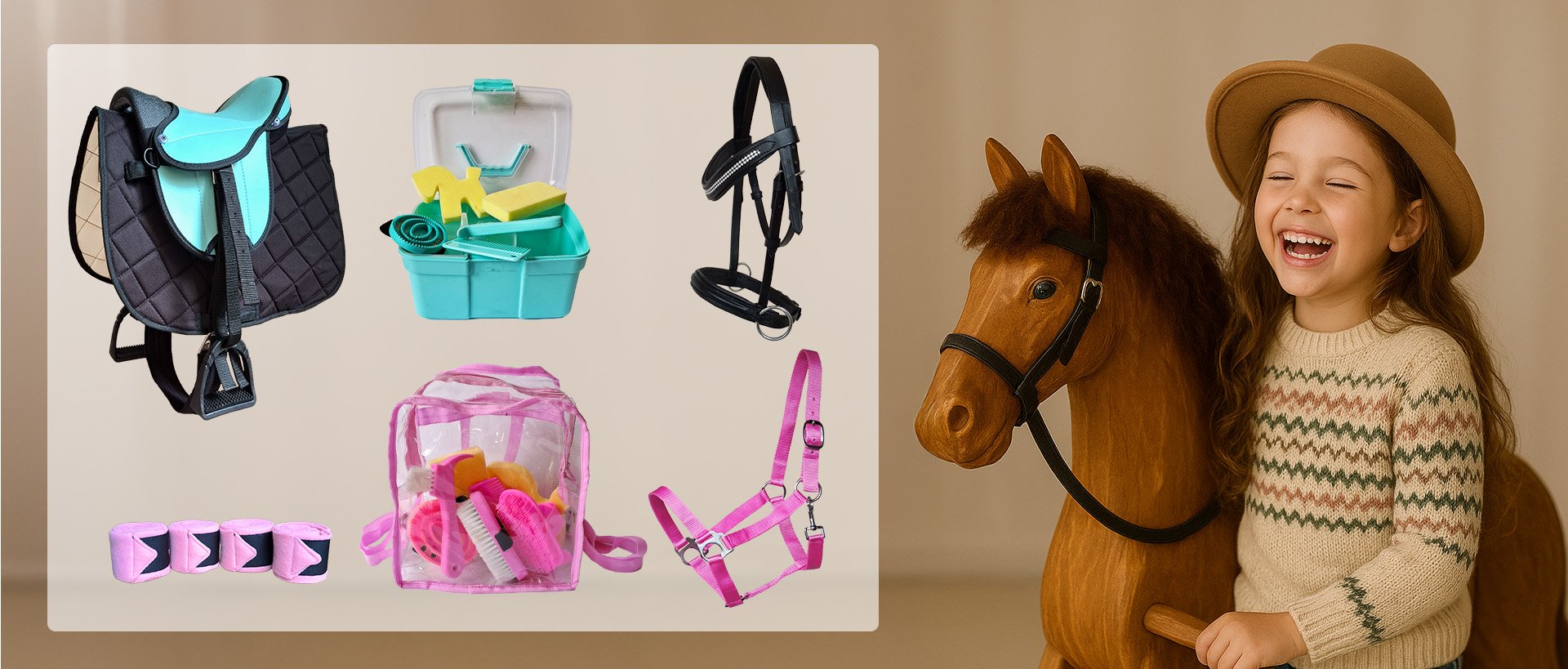 Dieses komplette Sattelset für Holzpferde in 10" verbindet robustes Synthetikmaterial mit einem auffälligen Blumenmuster – stilvoll, trendig und langlebig. In zwei modernen Farben erhältlich, sorgt es für realitätsnahes Spielen und kreativen Pferdespaß.